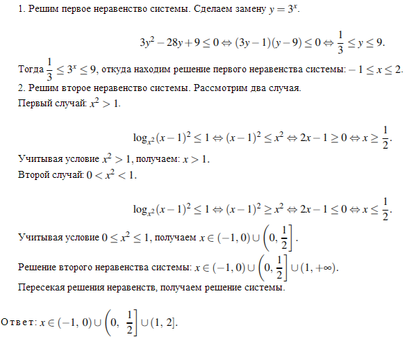 Решите систему system{3*9^x-28*3^x+9 меньше или равно 0;log(x^2)(x-1)^2 меньше или равно 1}