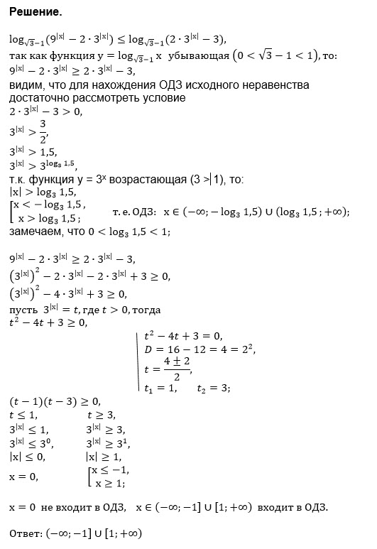 log(sqrt(3)-1)(9^(|x|)-2*3^(|x|)) меньше или равно log(sqrt(3)-1)(2*3^(|x|)-3)