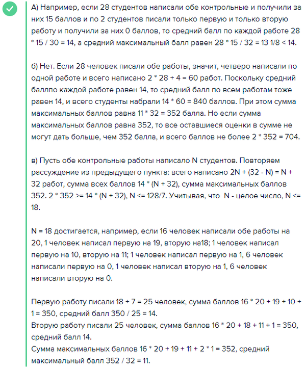 В группе 32 студента. Каждый из них пишет или одну, или две контрольные работы, за каждую из которых можно получить от 0 до 20 баллов включительно. Причем каждая из двух контрольных работ по отдельности дает в среднем 14 баллов. Далее, каждый из студентов назвал свой наивысший балл (если писал одну работу, то называл за нее), из этих баллов находили среднее арифметическое и оно равно S.