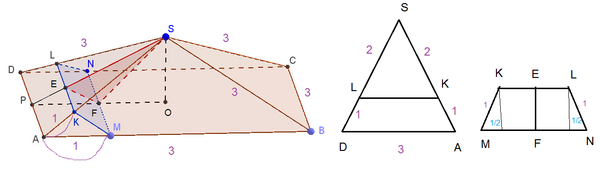 Расстояние от точки К до плоскости (SBC) равно расстоянию от точки S до плоскости KLMN, т. е расстоянию от точки S до прямой EF.