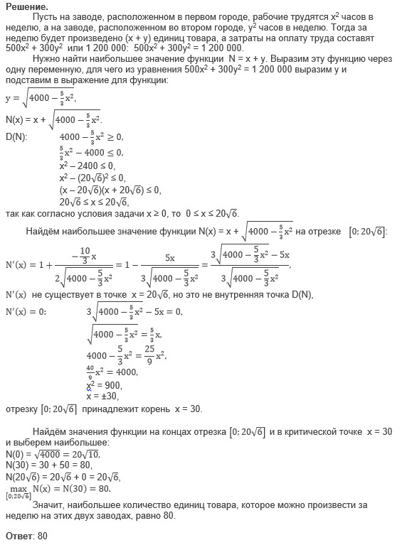 Вадим является владельцем двух заводов в разных городах. На заводах производятся абсолютно одинаковые товары при использовании одинаковых технологий. Если рабочие на одном из заводов трудятся суммарно t^2 часов в неделю, то за эту неделю они производят t единиц товара. За каждый час работы на заводе, расположенном в первом городе, Вадим платит рабочему 500 рублей, а на заводе, расположенном во втором городе, - 300 рублей. Вадим готов выделять 1 200 000 рублей в неделю на оплату труда рабочих. Какое наибольшее количество единиц товара можно произвести за неделю на этих двух заводах?