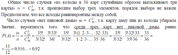 Из колоды в 36 карт случайным образом вытаскивают три карты. Какова вероятность того, что среди них нет пиковой дамы? Ответ округлите до сотых