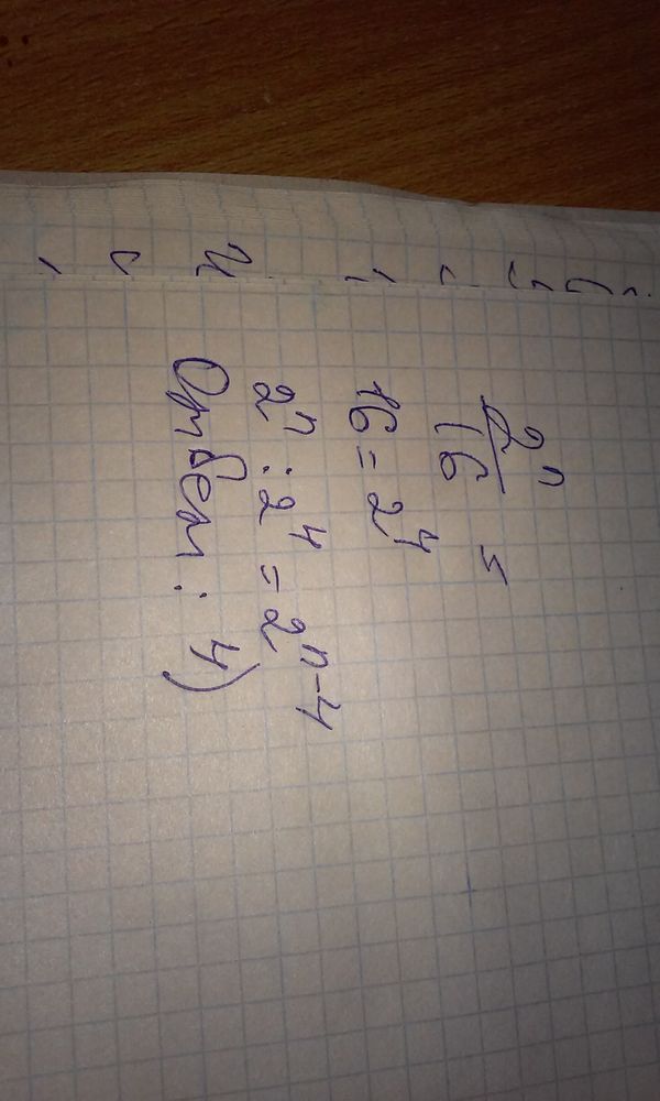3) Какое из данных выражений при любых значениях n равно дроби 2^(n)/16? 1) 2^(n)-2^4 2) 2^(n/4) 3) (1/8)^(n) 4) 2^(n-4)