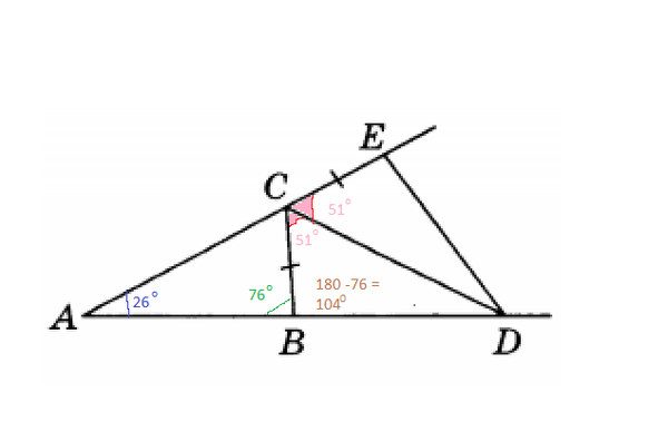 ∠ ВСЕ= ∠ ВАС+ ∠ АВС=26 градусов + 76 градусов = 102 градусов.