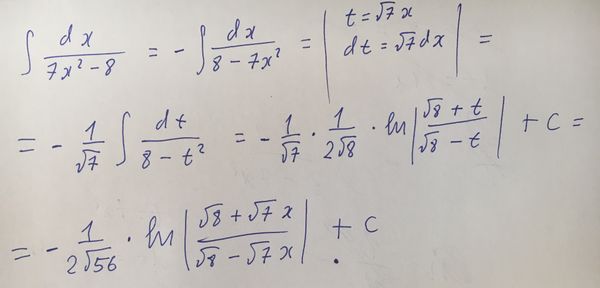 Найти интегралы непосредственным интегрированием: dx/(7x^2-8)