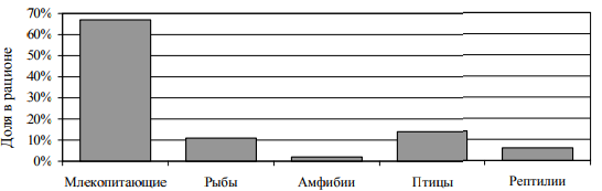 4) В рационе есть рыбы и амфибии, следовательно, животное полуводное.