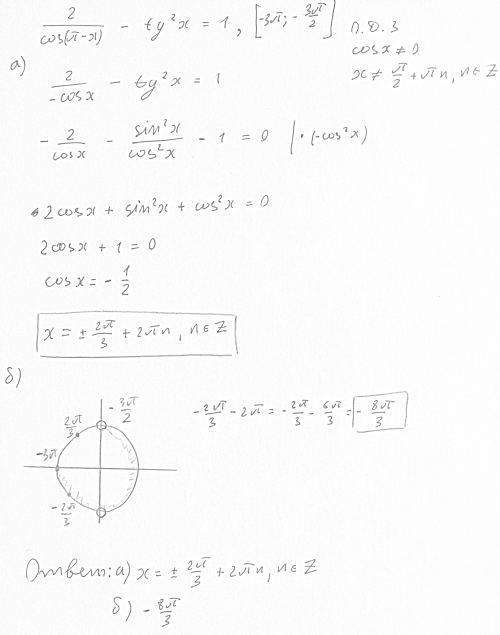 Дано уравнение 2/cos(Pi-x) - tg^2x = 1 A) Решите уравнение. B) Укажите корни этого уравнения, принадлежащие промежутку [-3Pi; -3Pi/2]