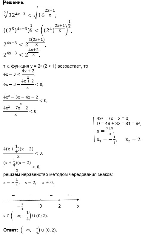 2^(5(4x-3)/5) < 2^(4(2x+1)/(2x)), т.к. 2 > 1, то 4x-3 < 2(2x+1)/x,