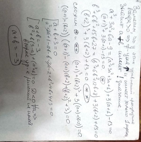 ФИЗТЕХ МАТ-7) Известно, что число a удовлетворяет уравнению x^3+3x^2+6x-9=0, а число b – уравнению x^3+6x^2+15x+27=0. Найдите наименьшее возможное значение суммы a+b .