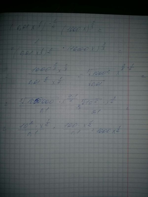 Вычислите (0,01x^(1/3))^(-1/2) * (1000x)^(2/3)