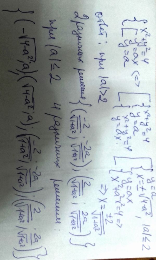 Сколько различных решений имеет система уравнений: system{x^2+y^2=4; (y-ax)(y-a)=0}