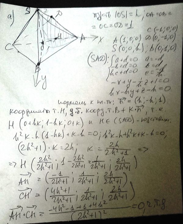 Из точки В опущен перпендикуляр ВН на плоскость SAD - это условие. Н лежит в плоскости SAD. Координаты этой точки я нахожу в решении.