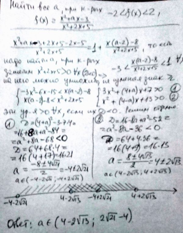 18) Найдите все значения а, при каждом из которых множество значений функции f(x)=(x^2+ax-3)/(x^2+2x+5) содержится в интервале (-2; 2).