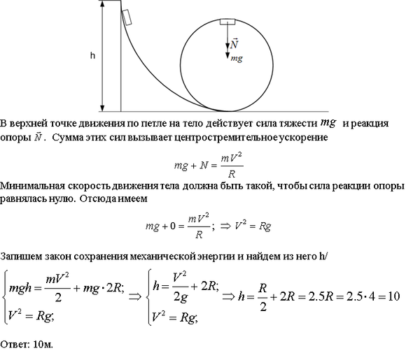 Тележка соскальзывает вниз без трения с высоты h по желобу, переходящему в "мертвую" петлю радиусом R = 4 м. Определить наименьшую высоту h min ската, при которой тележка не оторвется от пели в верхней точке траектории.
