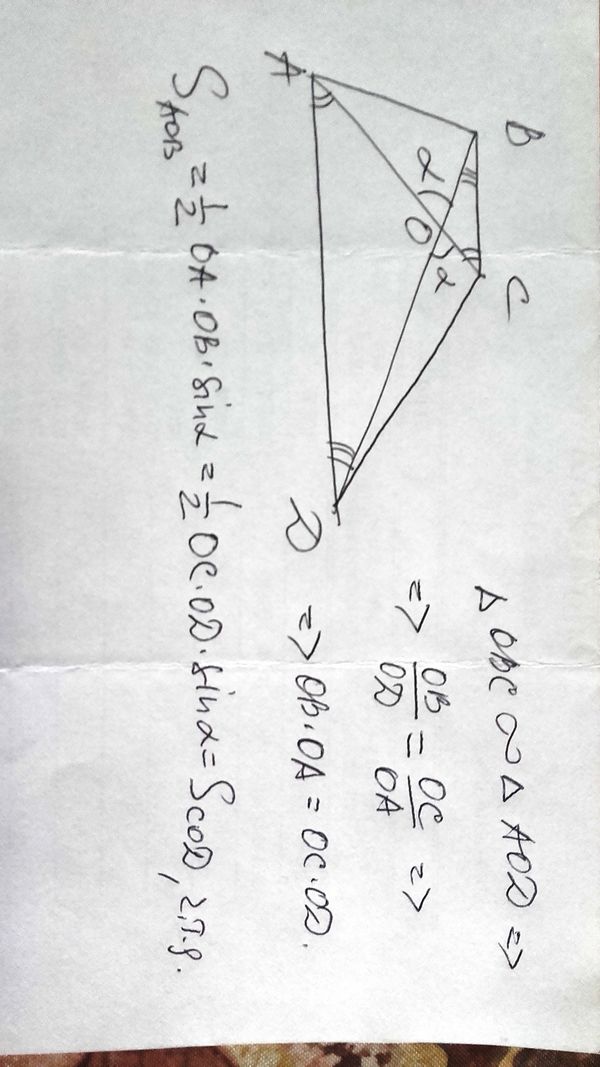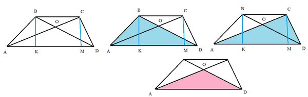 Какие площади? S( Δ ABD)=S( Δ ACD)=(1/2)AD*h, а S( Δ AOB)=S( Δ COD) ? см док-во