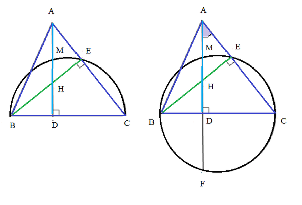 Значит точка Е - точка пересечения полуокружности с диаметром ВС и стороны АС.