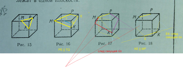 15. Сечение куба плоскостью. На рисунках 15—18 изображены кубы. Постройте сечение куба плоскостью, проходящей через точки М, Р, К.