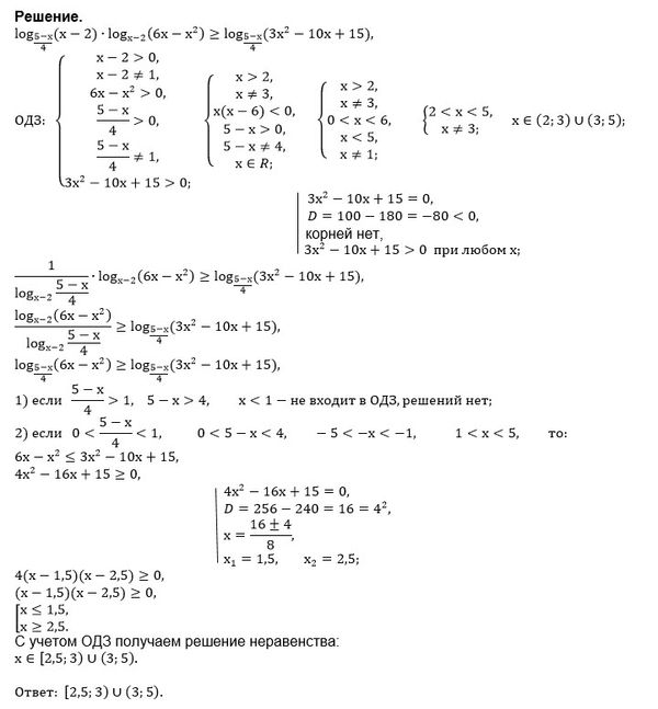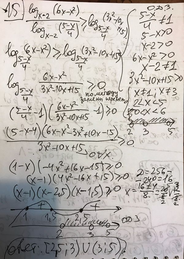 Ларин 15) Решите неравенство log((5-x)/4)(x-2)*log(x-2)(6x-x^2) больше или равно log((5-x)/4)(3x^2-10x+15)
