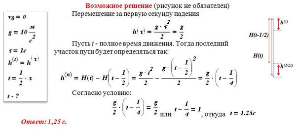 Тело, свободно падающее с некоторой высоты, первый участок пути проходит за время τ = 1 с, а такой же последний - за время ½τ. Найдите полное время падения τ, если начальная скорость тела равна нулю.