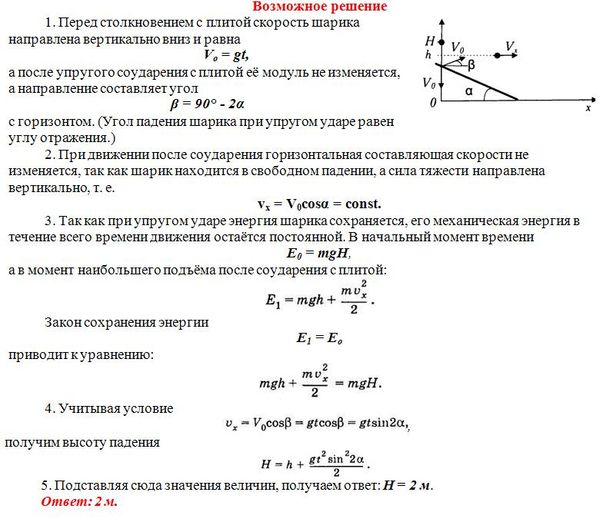 С высоты Н над землёй начинает свободно падать стальной шарик, который через время t = 0,4 с сталкивается с плитой, наклонённой под углом 30° к горизонту. После абсолютно упругого удара он движется по траектории, верхняя точка которой находится на высоте h = 1,4 м над землёй. Чему равна высота H? Сделайте схематический рисунок, поясняющий решение.