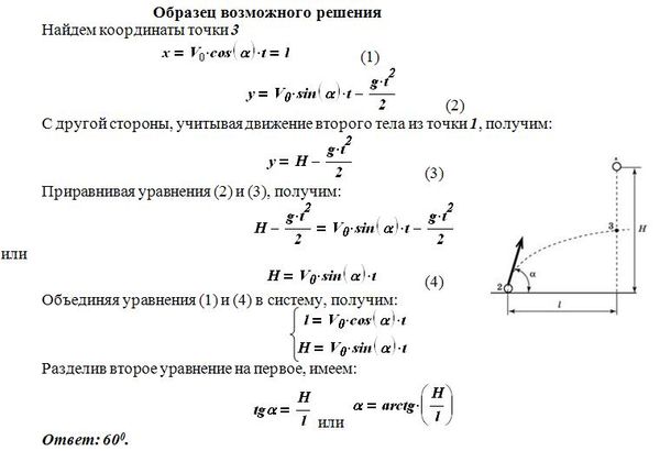 Из точки 1 свободно падает тело. Одновременно из точки 2 под углом α к горизонту бросают другое тело так, что оба тела сталкиваются в воздухе в точке 3 (см. рис.). Рассчитайте угол, под которым брошено тело из точки 2, если H/l = sqrt(3). Сопротивлением воздуха пренебречь.