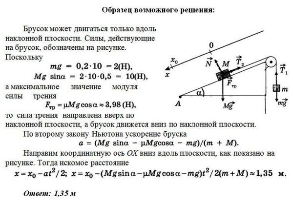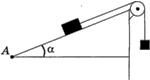 На наклонной плоскости находится брусок, связанный с грузом перекинутой через блок нерастяжимой нитью (см. рисунок). Угол наклона а плоскости равен 30°, масса бруска — 2 кг, коэффициент трения бруска о плоскость равен 0,23, масса груза — 0,2 кг. В начальный момент времени брусок покоился на расстоянии 5 м от точки А у основания плоскости. Определите расстояние от бруска до точки А через 2 с после начала движения.