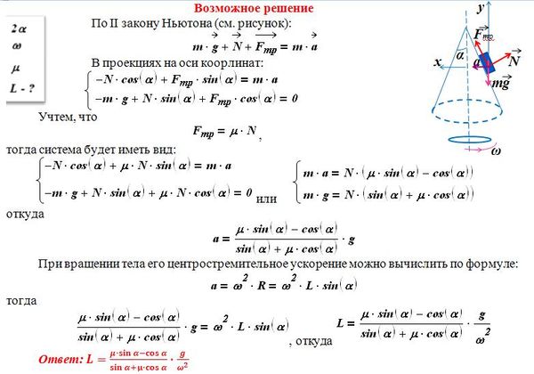 Полый конус с углом при вершине 2α вращается с угловой скоростью ω вокруг вертикальной оси, совпадающей с его осью симметрии. Вершина конуса обращена вверх. На внешней поверхности конуса находится небольшая шайба, коэффициент трения которой о поверхность конуса равен μ. При каком максимальном расстоянии L от вершины шайба будет неподвижна относительно конуса? Сделайте схематический рисунок с указанием сил, действующих на шайбу.