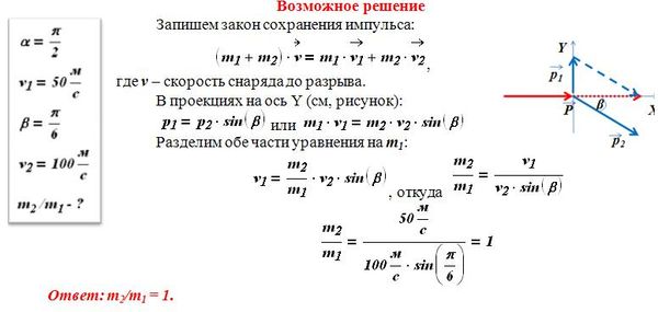 Снаряд, летящий с некоторой скоростью, разрывается на два осколка. Первый осколок летит под углом 90° к первоначальному направлению со скоростью 50 м/с, а второй – под углом 30° со скоростью 100 м/с. Найдите отношение массы первого осколка к массе второго осколка.