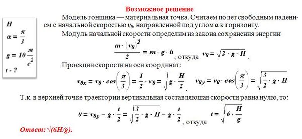 При выполнении трюка «Летающий велосипедист» гонщик движется по гладкому трамплину под действием силы тяжести, начиная движение из состояния покоя с высоты Н (см. рисунок). На краю трамплина скорость гонщика направлена под углом α = 60° к горизонту. Пролетев по воздуху, он приземлился на горизонтальный стол на той же высоте, что и край трамплина. Каково время полета?
