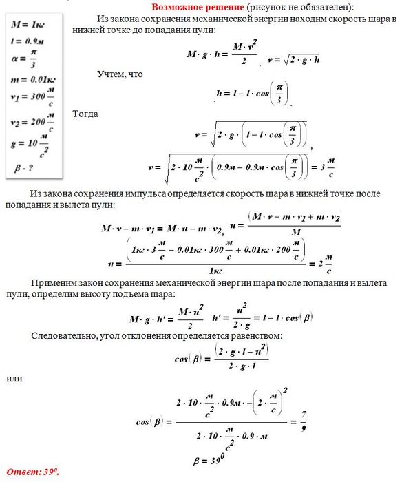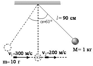 Шар массой 1 кг, подвешенный на нити длиной 90 см, отводят от положения равновесия на угол 60° и отпускают. В момент прохождения шаром положения равновесия в него попадает пуля массой 10 г, летящая навстречу шару со скоростью 300 м/с. Она пробивает его и вылетает горизонтально со скоростью 200 м/с, после чего шар продолжает движение в прежнем направлении. На какой максимальный угол отклонится шар после попадания в него пули? (Массу шара считать неизменной, диаметр шара — пренебрежимо малым по сравнению с длиной нити.)