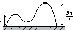На гладкой горизонтальной поверхности стола покоится горка с двумя вершинами, высоты которых h и 5/2 h (см. рисунок). На правой вершине горки находится шайба. От незначительного толчка шайба и горка приходят в движение, причём шайба движется влево, не отрываясь от гладкой поверхности горки, а поступательно движущаяся горка не отрывается от стола. Скорость шайбы на левой вершине горки оказалась равной v. Найдите отношение масс шайбы и горки.