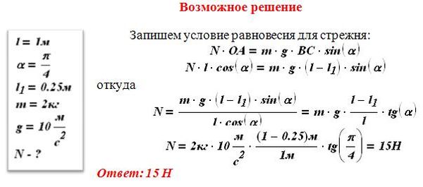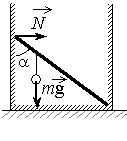 Невесомый стержень длиной 1 м, находящийся в ящике с гладкими дном и стенками, составляет угол α = 45° с вертикалью (см. рисунок). К стержню на расстоянии 25 см от его левого конца подвешен на нити шар массой 2 кг (см. рисунок). Каков модуль силы N, действующей на стержень со стороны левой стенки ящика?