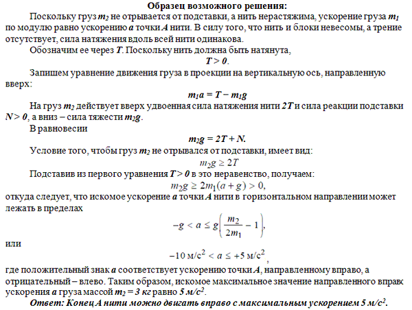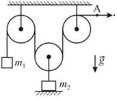 Конец А нити в системе, изображенной на рисунке, двигают в горизонтальном направлении вправо с некоторым ускорением a. При каком максимальном значении ускорения a груз массой m2 = 3 кг не будет отрываться от подставки, а нить, к другому концу которой прикреплен груз массой m1 = 1 кг, будет оставаться натянутой? Нить невесома и нерастяжима, блоки невесомы, трение отсутствует.
