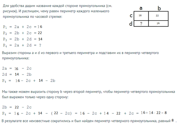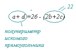 Сложим все три уравнения : a+c+ b+c +b+d =26, приведем подобные в левой части: a+ d + 2b+2c =26. Оставим a+ d в левой части (a+ d – это полупериметр нужного нам прямоугольника), остальное отправим в правую: a+ d =26 - (2b+2c) .