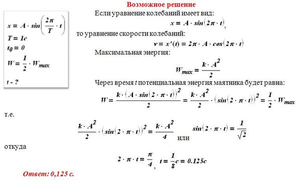 Смещение груза пружинного маятника меняется с течением времени по закону x = A sin 2πt/T, где период Т = 1 с. Через какое минимальное время, начиная с момента t = 0, потенциальная энергия маятника достигнет половины своего максимума?