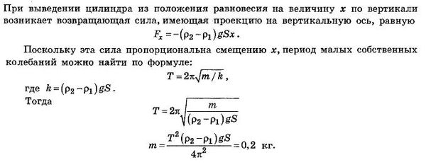 Однородный цилиндр с площадью поперечного сечения 10^(-2) м^2 плавает на границе несмешивающихся жидкостей с плотностью 800 кг/м^3 и 1000 кг/м^3 (см. рисунок). Пренебрегая сопротивлением жидкостей, определите массу цилиндра, если период его малых вертикальных колебаний π/5 с.