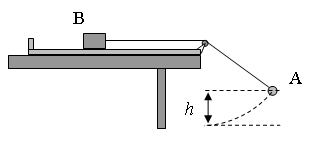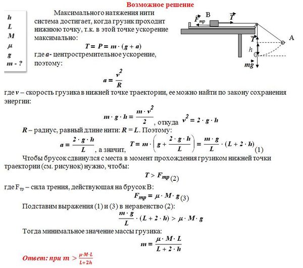 В установке, изображённой на рисунке, грузик А соединён перекинутой через блок нитью с бруском В, лежащим на горизонтальной поверхности трибометра, закреплённого на столе. Грузик отводят в сторону, приподнимая его на высоту h, и отпускают. Длина свисающей части нити равна L. Какую величину должна превзойти масса грузика, чтобы брусок сдвинулся с места в момент прохождения грузиком нижней точки траектории? Масса бруска M, коэффициент трения между бруском и поверхностью μ. Трением в блоке, а также размерами блока пренебречь.