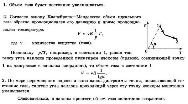 На диаграмме (см. рисунок) показан процесс изменения состояния фиксированного количества вещества идеального одноатомного газа. Опираясь на свои знания по молекулярной физике, объясните, как меняется объем газа по мере его перехода из состояния 1 в состояние 2.