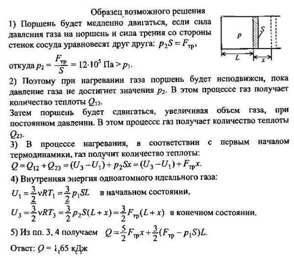 В горизонтальном цилиндрическом сосуде, закрытом поршнем, находится одноатомный идеальный газ. Первоначальное давление p = 4 • 10^5 Па. Расстояние от дна сосуда до поршня L = 30 см. Площадь поперечного сечения поршня S = 25 см^2. В результате медленного нагревания газа поршень сдвинулся на расстояние х = 10 см. При движении поршня на него со стороны стенок сосуда действует сила трения величиной F_(тр) = 3•10^3 H. Какое количество теплоты получил газ в этом процессе? Считать, что сосуд находится в вакууме.