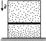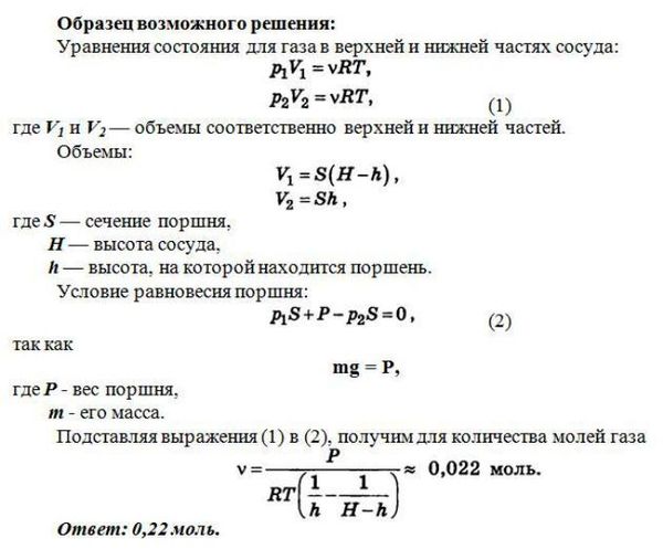 Вертикальный замкнутый цилиндрический сосуд высотой 50 см разделен подвижным поршнем весом 110 Н на две части, в каждой из которых содержится одинаковое количество идеального газа при температуре 361 К. Сколько молей газа находится в каждой части цилиндра, если поршень находится на высоте 20 см от дна сосуда? Толщиной поршня пренебречь.
