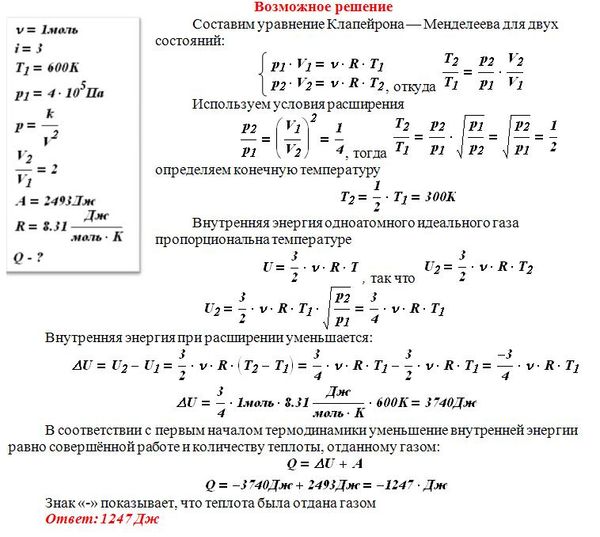 Один моль аргона, находящийся в цилиндре при температуре T1 = 600 К и давлении p1 = 4•10^5 Па, расширяется и одновременно охлаждается так, что его давление при расширении обратно пропорционально квадрату объёма. Конечный объём газа вдвое больше начального. Какое количество теплоты газ отдал при расширении, если при этом он совершил работу A = 2493 Дж?