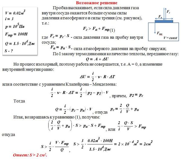 В сосуде объёмом V = 0,02 м^3 с жёсткими стенками находится одноатомный газ при атмосферном давлении. В крышке сосуда имеется отверстие площадью s, заткнутое пробкой. Максимальная сила трения покоя F пробки о края отверстия равна 100 Н. Пробка выскакивает, если газу передать количество теплоты не менее 15 кДж. Определите значение s, полагая газ идеальным.