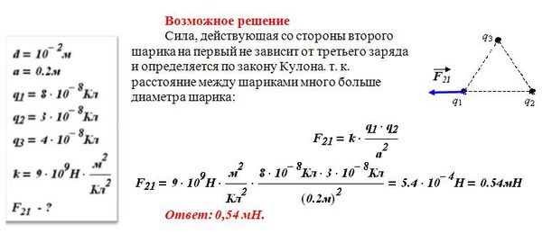 Три медных шарика диаметром 1 см каждый расположены в воздухе в вершинах правильного треугольника со стороной 20 см. Первый шарик несет заряд q1 = 80 нКл, второй q2 = 30 нКл, а третий q3 = 40 нКл. С какой силой второй шарик действует на первый? Ответ выразите в миллиньютонах и округлите до сотых.