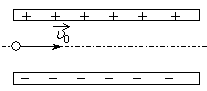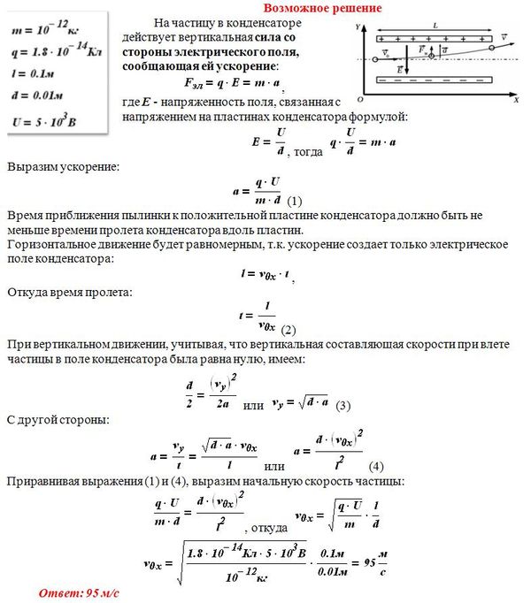Пылинка, имеющая массу 10^(-8) г и заряд – 1,8×10^(-14) Кл, влетает в электрическое поле конденсатора в точке, находящейся посередине между его пластинами (см. рисунок). Чему должна быть равна минимальная скорость, с которой влетает пылинка в конденсатор, чтобы она смогла пролететь его насквозь? Длина пластин конденсатора 10 см, расстояние между пластинами 1 см, напряжение на пластинах конденсатора 5000 В. Силой тяжести пренебречь. Система находится в вакууме.