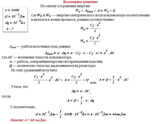 Источник постоянного напряжения с ЭДС 100 В подключён через резистор к конденсатору переменной ёмкости, расстояние между пластинами которого можно изменять (см. рисунок). Пластины медленно раздвинули. Какая работа была совершена против сил притяжения пластин, если за время движения пластин на резисторе выделилось количество теплоты 10 мкДж, и заряд конденсатора изменился на 1 мкКл?