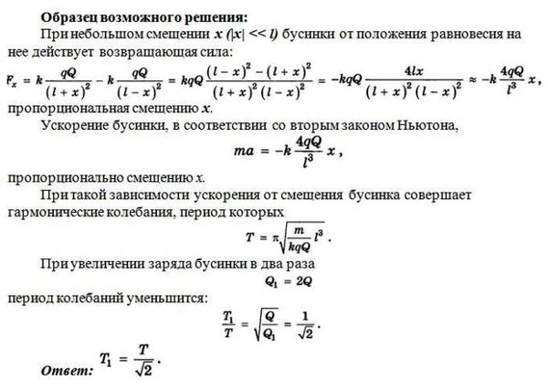 По гладкой горизонтальной направляющей длиной 2l скользит бусинка с положительным зарядом Q > 0 и массой m. На концах направляющей находятся положительные заряды q > 0 (см. рисунок). Бусинка совершает малые колебания относительно положения равновесия, период которых равен Т. Чему будет равен период колебаний бусинки, если ее заряд уменьшить в 2 раза?