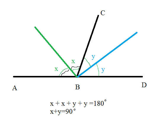 Сумма смежных углов 180 градусов, биссектрисы делят каждый угол пополам. Угол между биссектрисами смежных углов равен 90 градусов.