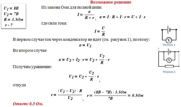 Схема электрической цепи показана на рисунке. Когда цепь разомкнута, вольтметр показывает 8 В. При замкнутой цепи вольтметр показывает 7 В. Сопротивление внешней цепи равно 3,5 Ом. Чему равно внутреннее сопротивление источника тока?