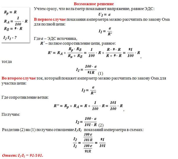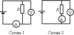 Одни и те же элементы соединены в электрическую цепь сначала по схеме 1, а затем по схеме 2 (см. рисунок). Сопротивление резистора равно R, сопротивление амперметра 1/100 R, сопротивление вольтметра 9R. Найдите отношение I2/I1 показаний амперметра в схемах. Внутренним сопротивлением источника и сопротивлением проводов пренебречь.