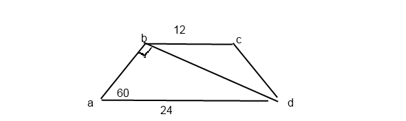 из условия следует, что треугольник abd прямоугольный, причем угол d равен 180-90-60=30, а сторона, лежащая напротив угла в 30 градусов равна половине гипотенузы в наше случае это будет ab=(1/2)ad=(1/2)24=12, ab=cd=12 тк трапеция равнобедренная. P=12+12+12+24=60
